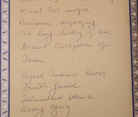 در پایان مولاژی از منشور کوروش؛ به رسم یادبود به رافائل گروسی تقدیم شد که ترجمه محتوای آن وی را تحت تاثیر قرار داد. مدیر کل آژانس بین المللی انرژی اتمی نیز به رسم یادبود در دفتر موزه ایران باستان نوشت: «فرصت بازدید از این موزه منحصر به فرد و آشنایی با تاریخ طولانی تمدن کهن ایران باعث افتخار من است”.
