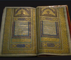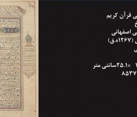 قرآن کریم به خط نسخ، رقم غلامعلی اصفهانی در سال ۱۲۶۷ه.ق با ترجمه فارسی به خط نستعلیق، ۱۷ سطر در صفحه بر روی کاغذ فرنگی که در قطع رحلی تحریر شده است.