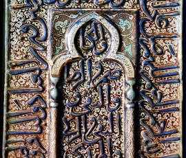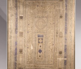 کاشی مستطیل شکل ۴۷ ×۳۶ سانتیمتر، زرین فام، از دورۀ ایلخانی، متعلق به کاشان، با طرح محرابی، در حاشیه و داخل محراب کتیبه ای به خط نسخ درشت شامل صلوات بر ائمه معصومین (ع) به صورت قالب زده و برجسته، که به رنگ لاجوردی نوشته شده است.