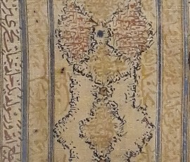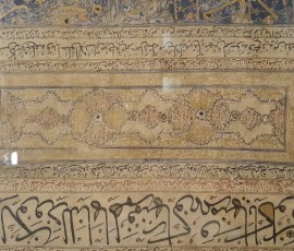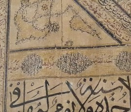 شرح اثر: قطعه پارچۀ کتان، کتیبه دار، نوشته شده به شیوۀ قلمکاری قلمی، مربوط به دورۀ صفوی، به شمارۀ ۳۴۱۰ در موزۀ ملّی ایران محفوظ است که تجلی عشق و معرفت بوده و از شاهکارهای هنری این دوره است.