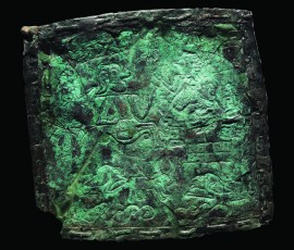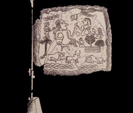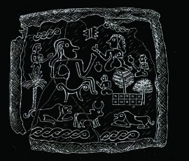 دورتادور این صحنه، که در باغی با درختان نخل و درختان پهن برگ واقع است، افرادی نشسته و زانوزدهاند. نوار بافته در بالا و پایین نشانه جریان آب است. در زیر تصویر افراد، حمله گربهسانان وحشی به گاوی کوهان دار نشان داده شدهاست.
