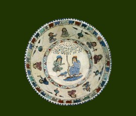 نقش اصلی در کف ظرف سفال مینایی سدۀ هفتم هجریقمری، نگاره دو نفر(زن) است که زیر درخت میوهداری نشسته و در حال گفتگو هستند. روبروی آنها برکه کوچک آب و یک پرنده دیده میشود. نقش بر زمینه سفید کشیده شده و در یک کادر مدور ( حصار) محاط است.