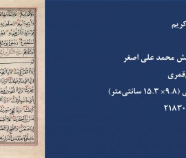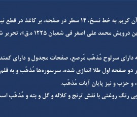 نسخۀ قرآن کریم به خط نسخ، ۱۴ سطر در صفحه، بر کاغذ در قطع نیم ربعی با رقم « ابن درویش محمد علی اصغر فی شعبان ۱۲۲۵ ه.ق»، تحریر شده است.