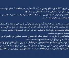 این نسخه دارای تاریخ ۹۵۲ ه. ق.، قطع رحلی بزرگ، ۱۱ سطر در هر صفحه( ٢ سطر درشت در بالا و پایین هر صفحه محقق و سطر درشت میانی به ثلث، ٨ سطر ریز به نسخ).