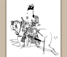 طبق گفته میرزایی: نقاش، اسب را که در حال تاختن است، واقعگرایانه تر از سوار کار ترسیم کرده و سوار را با کلاهی قبه مانند بر سر، جبه ای ابریشمین بر تن، با اجزای لباس و تجهیزات و همچنین ساز و برگ بسیار غنی نشان داده است.