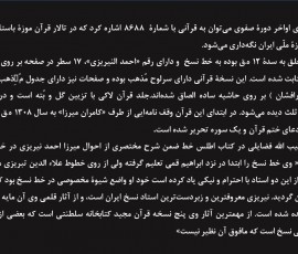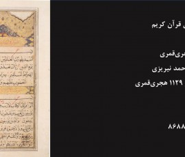 این نسخه که متعلق به سدۀ ۱۲ ه.ق بوده به خط نسخ و دارای رقم «احمد النیریزی»، ۱۷ سطر در صفحه بر روی کاغذ ترمه که به سال ۱۱۲۹ ه.ق کتابت شده است و دارای سرلوح مُذهب بوده و صفحات نیز دارای جدول مُِذهب و کمند هستند. متن جدولها (زرافشان ) بر روی حاشیه ساده الصاق شدهاند. جلد قرآن لاکی با تزیین گل و بُته است و در یک حاشیه آن کتیبهایی به خط ثلث دیده میشود. در ابتدای این قرآن وقف نامهایی از طرف «کامران میرزا» به سال ۱۳۰۸ ه.ق نوشته شده و در انتهای قرآن نیز دعای ختم قرآن و یک سوره تحریر شده است.